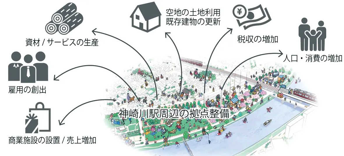 このプロジェクトにより、1,000億円以上の経済波及効果(整備工事や商業施設の設置、土地利用の増進など)を見込んでいます。