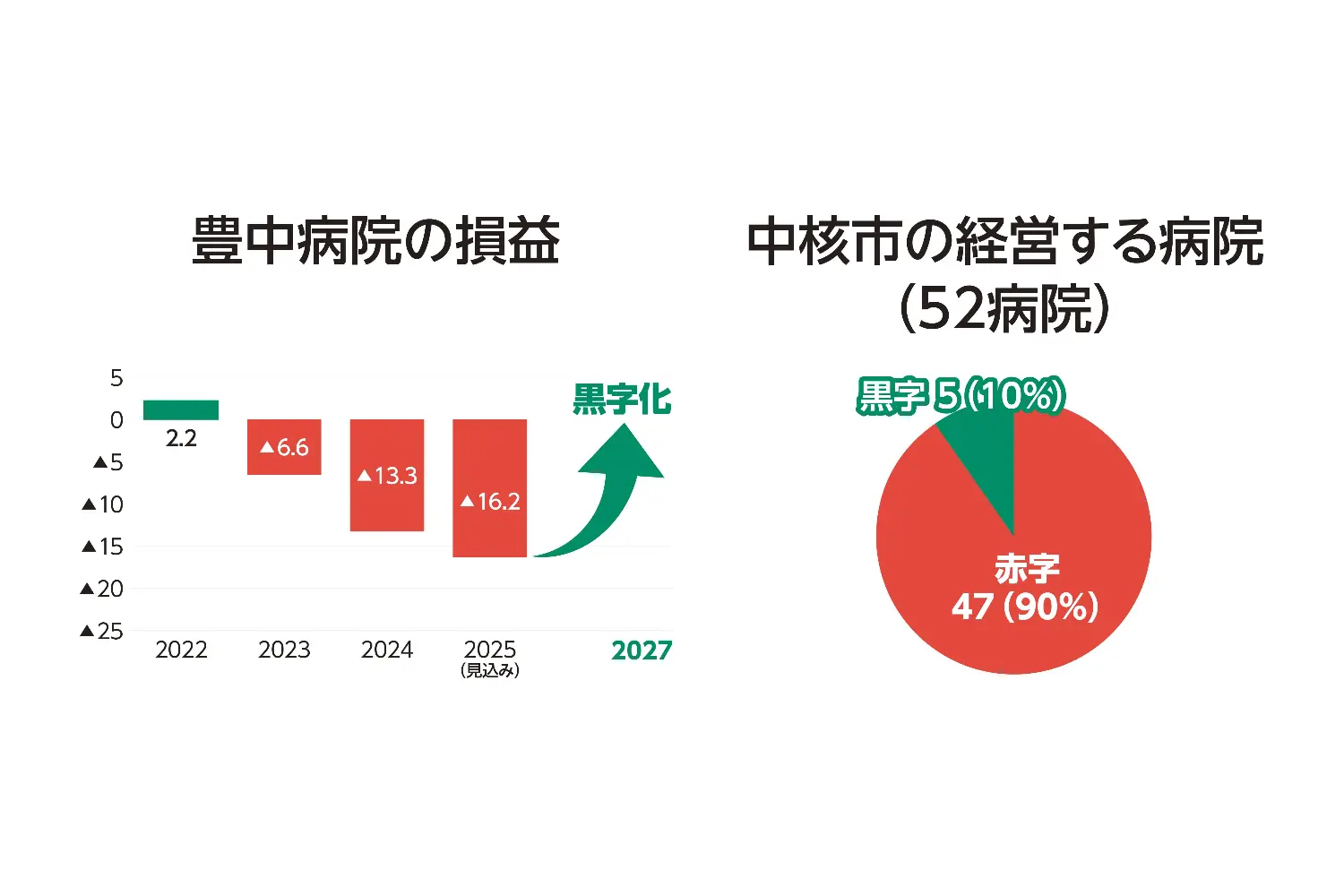 令和6年度決算で13億3千万円の赤字、令和7年度決算は16億2千万円の赤字見込みです。これは豊中市に限った状況ではなく、市立病院を経営する全国の中核市(豊中と類似団体)の約9割が赤字となっています。